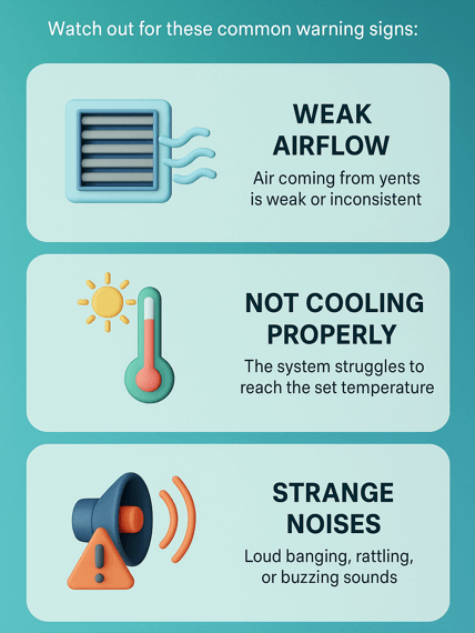 These may seem minor, but they’re usually the first indicators that your system is struggling in Florida’s heat.